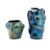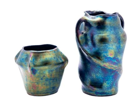 Two Heliosine Austrian iridescent pottery vases, one of wrythen form with twin handles and oval rim, 18cm high, the companion of vertically ribbed form, 11cm high, together with another pottery vase of lobed organic form under a crystalline glaze, 15cm high, circa 1900. [3]