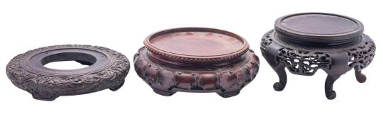 A large Chinese hardwood 'dragon' stand and two others, Qing dynasty and later the first finely carved with a continuous frieze of dragons chasing the sacred pearl, 29cm; the second carved with pendant lappets, 30cm; the third carved and pierced, on five raised legs, 26cm [3].