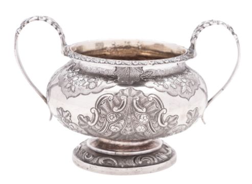 A George IV two-handled silver sugar bowl, of squat circular form, with a border of alternating acanthus leaves & rosettes, the body masterfully chased and embossed in the rococo manner, raised on a spreading foot and with a gilt interior, by Joseph Angell, London 1825; 8.1" (20.5cm) long; 18.4ozt