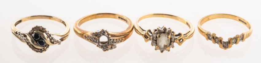 A group of eight rings, (mainly damaged/stones missing), including a 9ct gold wedding band, UK hallmark, size T1/2, 2.1grams; a 9ct gold wishbone style ring set with cz's, UK import mark, size L1/2, 1.4grams; a 9ct gold cluster ring set with an oval-cut white paste stone and two small single-cut diamonds in an illusion style setting, UK hallmark, size O1/2, 2.0grams; a twist designed ring set with a circular-cut blue stone and two single-cut diamonds, UK import mark, size M, 1.8grams; a 9ct gold ring set with small single-cut diamonds, central stone missing, UK hallmark, size M, 2.4grams; a 9ct gold signet ring set with an oval onyx plaque, UK hallmark, size approx. 01/2, 1.5grams; a 9ct gold wishbone ring set with alternating dark blue sapphires (one missing) and small brilliant-cut diamonds, size K1/2, 1.6grams; and a 9ct gold ring set with two dark blue sapphires and small single-cut diamonds, (some missing), UK import mark, size approx. M, 1.9grams, (8).