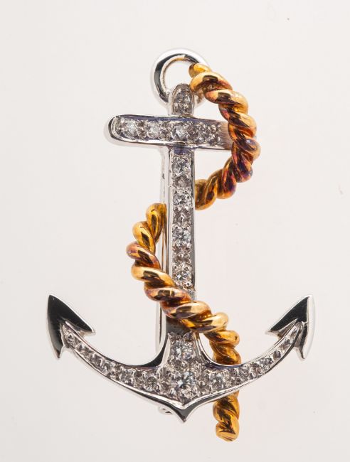 An 18ct gold diamond anchor brooch, a white gold anchor grain set with brilliant-cut diamonds and entwined with a yellow gold rope twist, diamonds approx. 0.18 carat total, UK hallmark, 750, length approx. 3.0cm, 6.4grams.