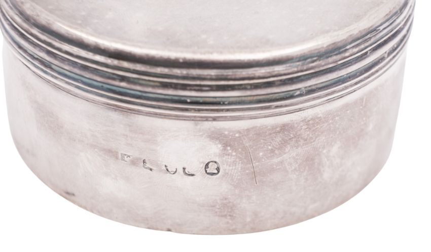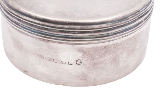 A George III silver box & cover, of circular form, with a reeded border and crested on the cover, maker's mark "JJ", London 1819, together with a George III silver cream jug, with embossed decoration, marks worn, crested, London 1771; the box 3.1" (8cm) diameter; 5.25ozt (2)