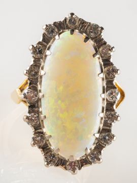 An opal and diamond cluster ring, of elongated oval form, claw set to the centre with an oval-cut opal cabochon, measuring approx. 21.0mm x 10.5mm, with an illusion set surround of sixteen brilliant-cut diamonds, bi-colour metal, marked 18ct, size I1/2, 8.8grams.(Note: there is a finial decoration missing between the 'V' split to one shoulder and the shank is misshapen and there is one claw missing).