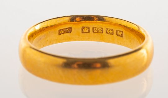 A 22ct gold wedding band, UK hallmark, size K, 6.0grams.