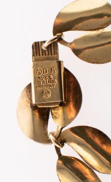 David Anderson, a Scandinavian silver gilt and enamel bracelet and matching clip-on earrings, the articulated bracelet of double leaf form with red enamelling, push in clasp, marked D-A and makers mark for David Anderson, 925s Sterling, Norway, length approx. 18.0cm, 13.5grams; and a pair of matching double leaf red enamelled clip-on earrings, marked D-A and makers mark for David Anderson, 925s Sterling, Norway, length approx. 1.7cm, 3.4grams, (2)