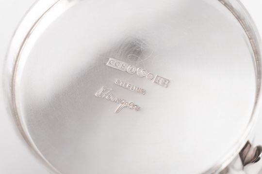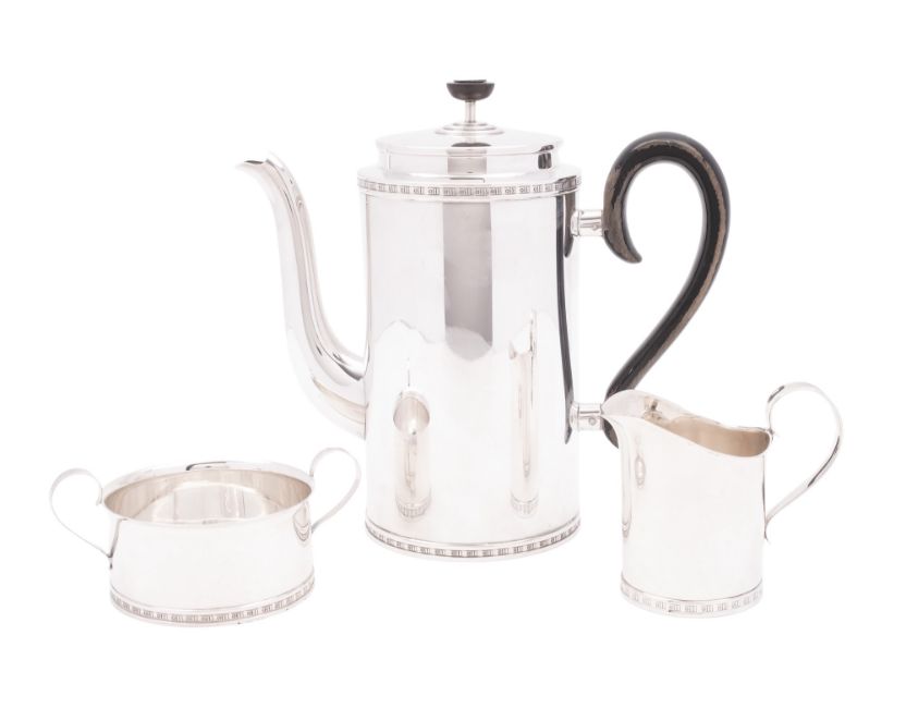 A 20th century three-piece Swedish coffee service, designed by Vera Ferngren, of cylindrical form, with chased borders and "S"-scroll handles, each piece with the designer's facsimile signature, by C.G Hallberg, Stockholm 1961; the coffee pot 7.3" (18.7cm) high; 20ozt (3)