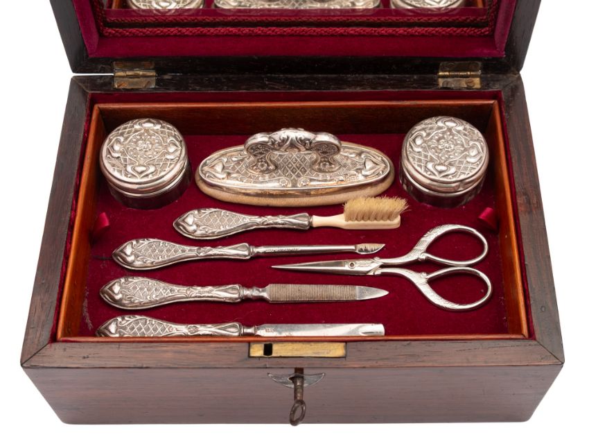 An Edwardian Art-Nouveau cased eight-piece dressing set, with embossed stylised decoration, the implements with steel blades and the rosewood box with an internal mirror, by William Devenport, Birmingham 1909; the box 8.1" (20.5cm) long
