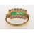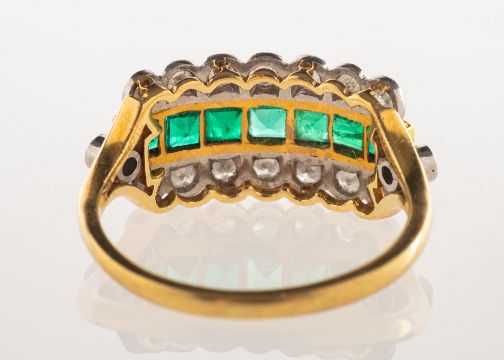 A 1980's 18ct gold emerald and diamond ring, a three row ring, the centre channel set with square-cut emeralds and set each side with a row of scalloped edge set brilliant-cut diamonds, and a brilliant-cut diamond set to each openwork 'v' split shoulder, UK hallmark, size L, 3.2grams.(Note: The ring is in fair condition commensurate with its age and wear. The shank still has life left in it, however there are signs of wear and the metal is scratched and nicked. The gallery needs some work and the openwork is split in places. Currently all stones are secure in their settings. Examining the emeralds with 10 x magnification there are facet and girdle edge abrasions, nicks and chips, there is one particular emerald near the middle that has quite a chip to it and this maybe possibly to see with the naked eye. Examining the diamonds with 10 x magnification there are facet and girdle edge abrasions, nicks and tiny chips).