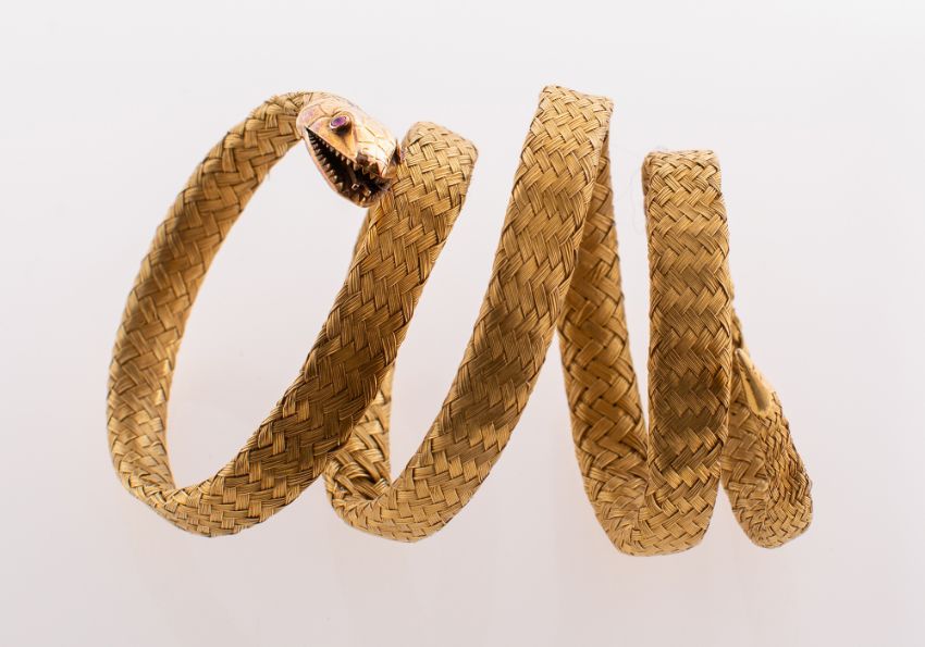 A Victorian woven snake bracelet, the flexible coiled woven wirework bracelet has a carved serpent's head with red stone cabochon eyes, (possibly ruby cabochons), and showing sharp teeth and a forked tongue, the bracelet terminates with a pointed tail, unmarked yellow metal, length overall approx. 60.0cm (measured around the outside of the snake), 39.6grams, (Note: the bracelet is slightly misshapen and flattened in a few places and there are some odd loose wires).