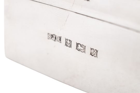 An Elizabeth II silver cigarette box, plain rectangular with a cedarwood lining, by S.J Rose & Son, Birmingham 1974, together with a small spirit flask, inscribed and a pair of silver mounted clear glass table coasters, by different makers & dates; the cigarette box 6.1" (15.5cm) long; 1.6ozt weighable silver (4)