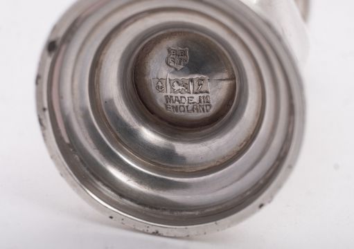 An Elizabeth II three-piece silver condiment set, circular form and with panelled bodies (blue glass liners), by Barker Brothers Silver Ltd, Birmingham 1956, together with, 2 condiment spoons, a silver cigarette case and a mounted pepper mill (steel innards), by different makers & dates; the cigarette case 3.25" (8.2cm) long; 4.6ozt (7)