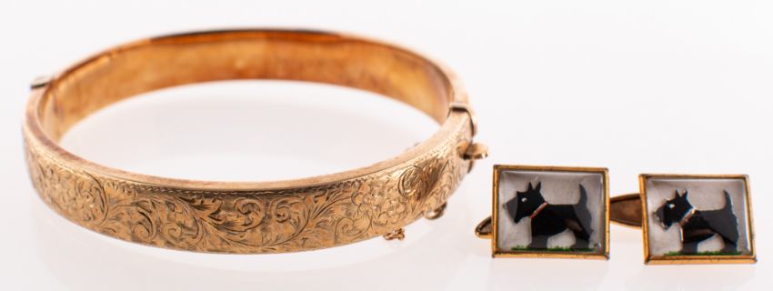 A 1950's 9ct gold bangle and a pair of vintage Scottie dog cufflink's, the hinged bangle with carved scroll, floral and foliate engraving to the front section, plain to verso, push-in clasp, safety chain, UK hallmark, Chester, 1958, S&P, (Smith & Pepper), inner diameter approx. 5.8cm, 12.4grams; and a pair of vintage gilt Essex crystal style cufflink's depicting Scottie dogs, chain link fittings, (2).