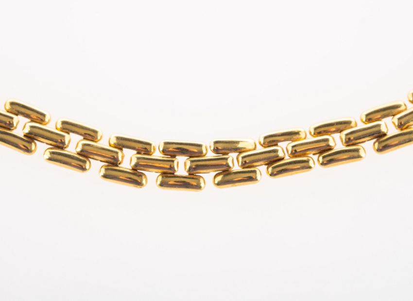 A brick link style necklace, polished finish, each necklace end marked 18k and MC, length approx. 43.0cm, width of links approx. 0.5cm, 21.3grams.