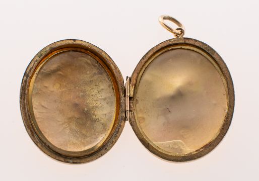 An oval locket pendant, the front panel having floral and foliate carving on a textured background, marked 9ct to verso, length approx. 4.0cm, (not inc. jump ring), 12.8grams.