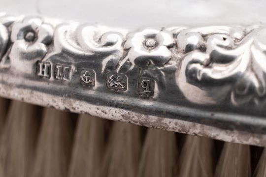 Silver dressing table items, to include 2 mounted clear cut-glass scent bottles, 2 hair brushes, 2 clothes brushes, a hand mirror and a shoe horn (steel blade), by different makers & dates; the mirror 10.7" (17.1cm) long (8)