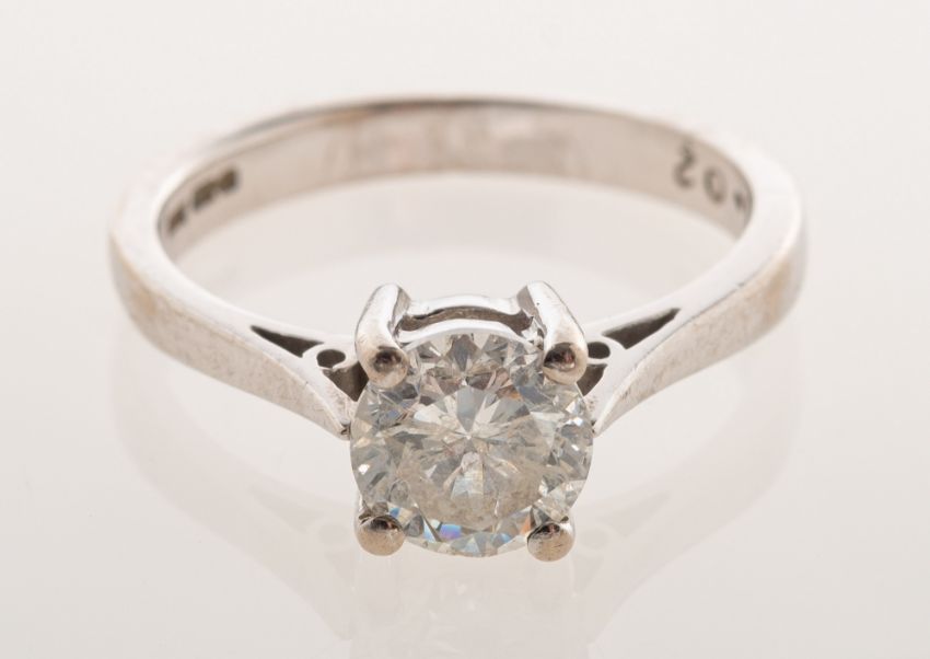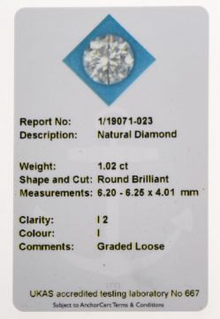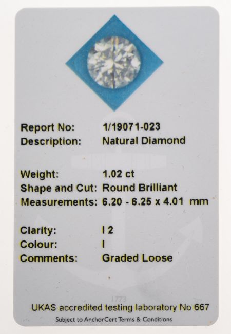 A platinum 1.02 carat diamond solitaire ring, four claw set with a brilliant-cut diamond, 1.02 carats, colour I, clarity I2, partial UK hallmark, size I1/2, 3.3grams; accompanied by its AnchorCert Diamond Report number 1/19071-023, stating it is a natural diamond and the above information.(Note: the diamond is loose in its setting and will need tightening by a Goldsmith).