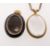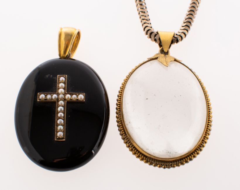 A Victorian hairwork mourning pendant and one other pendant with chain, the oval carved black (possibly jet) pendant, is set centrally to the front with a yellow metal cross, set with seed pearls, to verso is a yellow metal mounted glass keepsake compartment with a coiled lock of hair, yellow metal bale, unmarked, length approx. 5.0cm (inc. bale), 15.5grams; and a Victorian gilt glass keepsake pendant, (back missing), length approx. 5.0cm, on a snake style chain with swivel clasp and hook fitting, unmarked silver/light yellow tone metal, length approx. 54.0cm, total gross weight 40.0grams, (2).