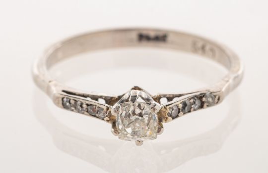 An Art Deco diamond ring, claw set to the centre with an old cushion-cut diamond, diamond approx. 0.30 carat, measuring approx. 3.6mm x 3.6mm x 2.8mm, the shoulders grain set each side with four old-cut diamonds, diamonds approx. 0.04 carat total, marked PLAT, size M, 2.4grams.