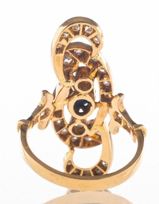 An antique sapphire and diamond dress ring, (possibly late Victorian/early Edwardian), of elongated scroll and foliate design, claw set to the centre with a dark blue sapphire cabochon, the surrounding scrollwork is grain set with a mixture of old-cut diamonds, (one diamond missing from shoulder setting), unmarked yellow metal, length of head setting approx. 3.4cm, size O1/2, 7.2grams.(Note: we are unable to identify whether the sapphire is natural or synthetic due to its dark colour and cut).