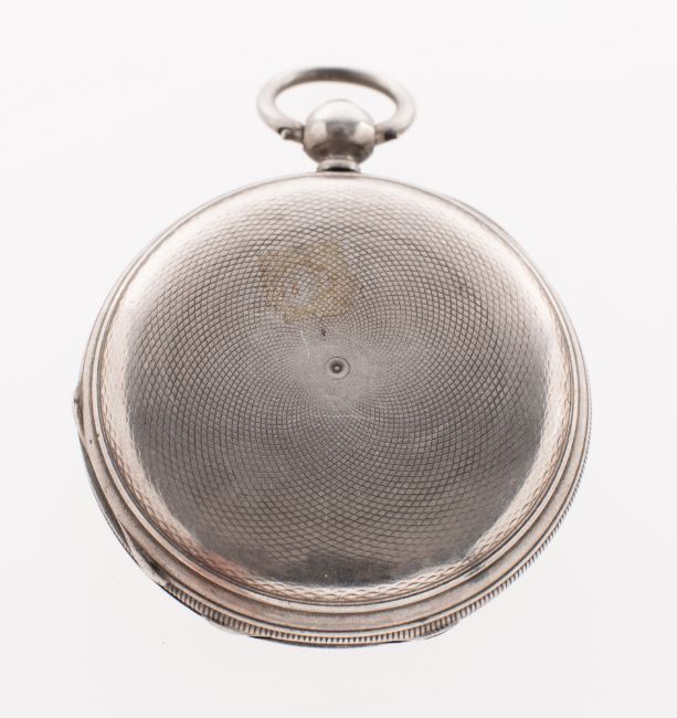 James McCabe, Royal Exchange, London, 07879, a small silver full-hunter pocket watch, the dial having black Roman numerals, gold fleur-de-lys hands, a subsidiary seconds dial and signed James McCabe, Royal Exchange, London, 07879, the full-plate movement engraved with repeat signature and having an engraved balance cock to the gold three-bar balance and over-coil hairspring, the case hallmarked for London 1848 and stamped with the case maker's initials, AT for Alfred Thickbroom, 10 Galway Street, Bath Street, London, diameter 46mm, gross weight c.83.26gs.