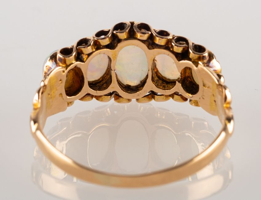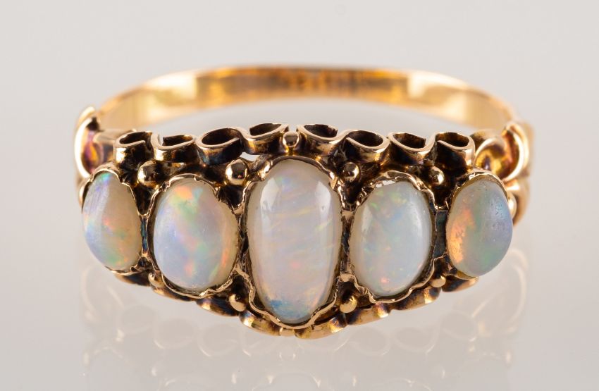 A Victorian five stone opal ring, set with five graduated oval opal cabochons, ornate setting and carved shoulders, unmarked yellow metal, size K1/2, 1.8grams.
