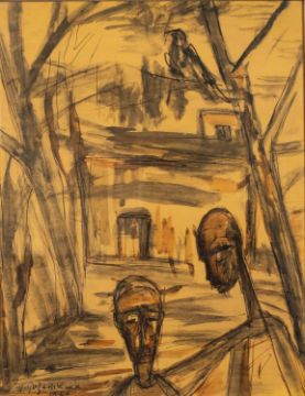 Houshang Pezeshknia (Iranian, 1917 - 1972) -Two figures and trees in a townscape -Pen, ink and colour wash -64 x 49cm, 68 x 53cm framed -Signed lower left and dated 1960.