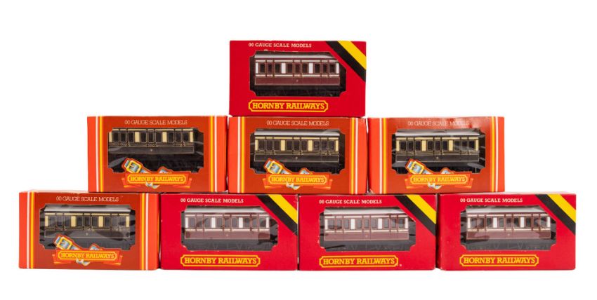 Eight Hornby OO/HO four wheel passenger coaches. Comprising four in Caledonian Railways livery and four in GWR brown and cream, all boxed.