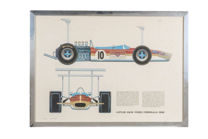 Rex Knight. A group of four racing cars portrait prints 'Lotus 49B Ford Formula One', 'JPS Lotus 72D Formula One', 'Mantra MS II Formula One' and 'Lola 332 Formula 5000', framed and glazed 37x52cm (4)