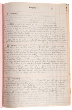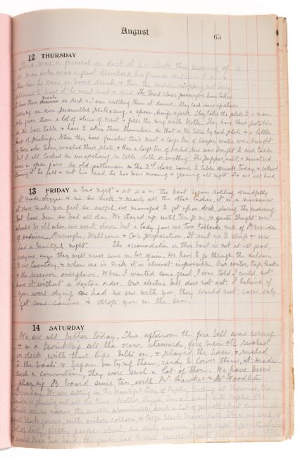 A late 19th Century diary of a voyage to Australia aboard the Orient, manuscript on paper in ink and pencil, circa 100pp interleaved with blotting paper in a 'Boots Scribbling Diary for 1897', orig. boards, folio. The diary details their and their family's preparation and voyage aboard the Orient, including sending monies, the making of wills and auctioning their possessions, the boarding and journey to Australia, daily entries highlighting conditions on board, the weather and seasickness as well as other passengers are regularly noted. Together with a book of crests and a map.NOTE: The Orient was the first ship commissioned by the Orient Steam Navigation Company in 1879, this firm would go on to merge with P&O.