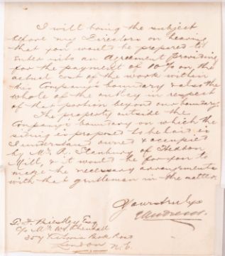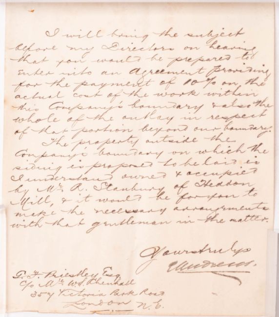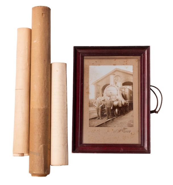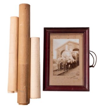 RAILWAYS. London and South Western Railway, Ilfracombe line. Two manuscript letters over 4 sheets, LSWR Engineer's Office Waterloo,1898, with one plan and 6 OS maps, and a part map, related to proposals for the sidings at Heddon Mill, together with a framed photograph of North London Railway 2-2-0 locomotive 'Kew Bridge' No.86 circa 1900, 16cm x 11cm. (11)