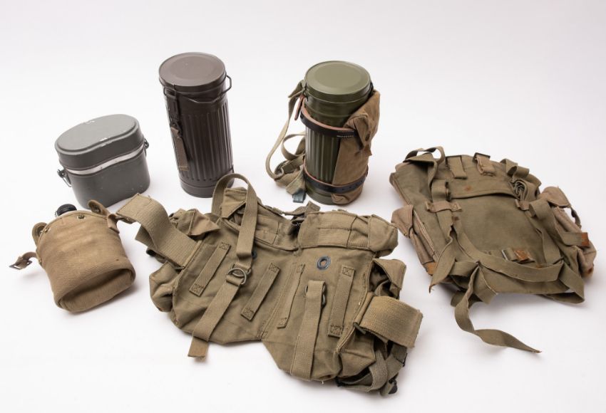 A collection of late 20th Century soldiers accessories. Including three canteens, two sacks, a white leather belt with cartridge cases and a belt with mess tin and shovel etc.