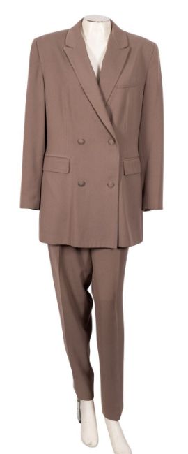 Jones New York, a black silk two piece suit, consisting of a jacket and trousers, US size 14, together with a Garfield and marks tan two piece suit, consisting of a jacket and trousers, size 12. (4)