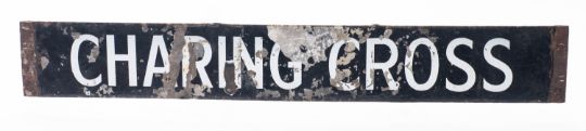 A 20th Century double sided railway station enamel sign 'Charing Cross/Hammersmith'. Of rectangular form with white lettering on a black ground, 11cm high, 73cm wide.