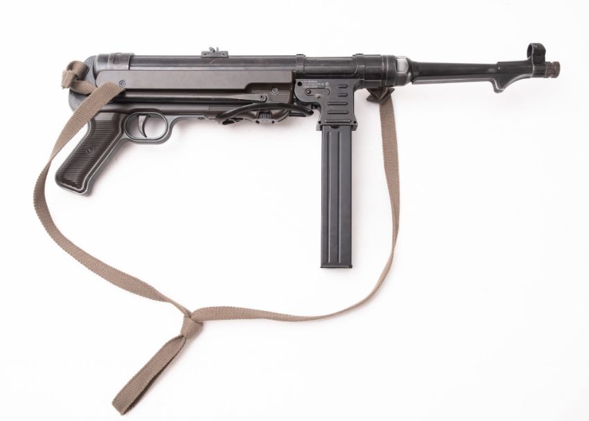 A German MP40 .177 calibre BB CO2 sub machinegun. Serial number D23D113701, with magazine, folding stock and canvas strap.