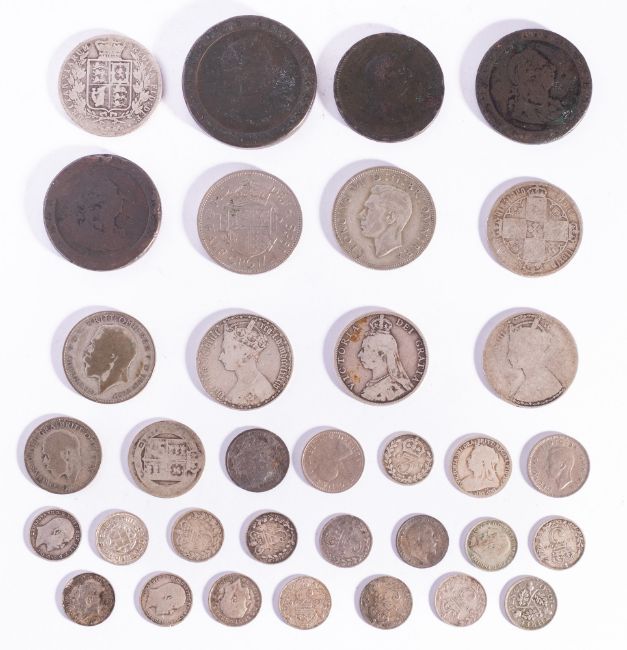 A collection of British coins. Including an 1885 half crown, 1889 florin, 1870 and 1874 florins, plus a Georgian cartwheel two pence and pennies etc.