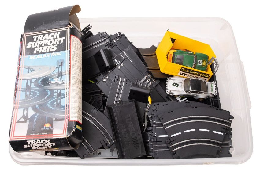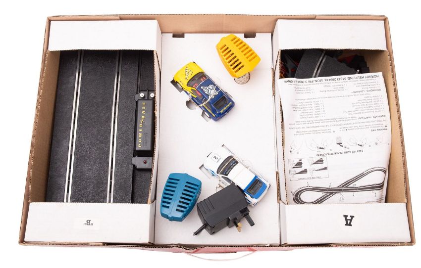 Scalextric Set C.814 'Team Cosworth' together with set G1013 Micromania Scorpion Strike, an unboxed Capri 3 Litre, C125 Porsche 911 and SCX Porsche 959 and other accessories.