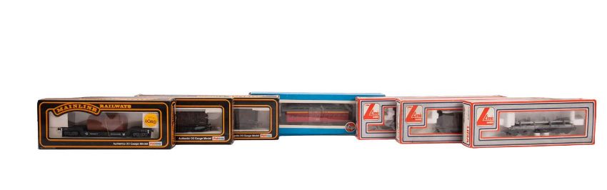 A collection of OO/HO gauge goods wagons. From Mainline and Lima including milk vans, flat beds and box vans, together with a CPRR passenger coach, all boxed. (7)
