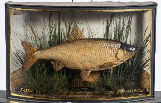 An early 20th century cased taxidermy roach, preserved by J Cooper & Sons, London, naturally set in a bowfront cased with gilt title 'Roach. Taken by R French, at Reading Nov.1st , 1928, Wgt 1lbs 13 1.4oz', taxidermist label upper left backboard, 31x48.5x13cm