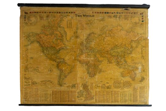 A 1968 Stanfords Library map of the British Isles. In colour and linen backed with wooden brackets, together with a similar Bacons New Chart of the World. (2)