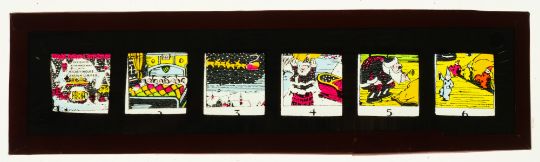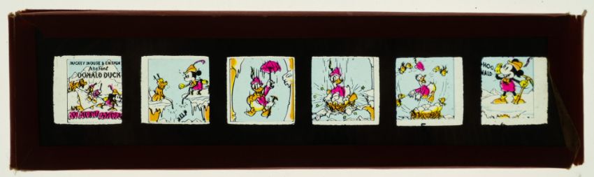 A group of nine Walt Disney magic lantern lithograph printed slide sets, including Donald Duck in 'An Alpine Adventure', 'Mickey Crusoe' and others. ( contents unchecked for completeness)