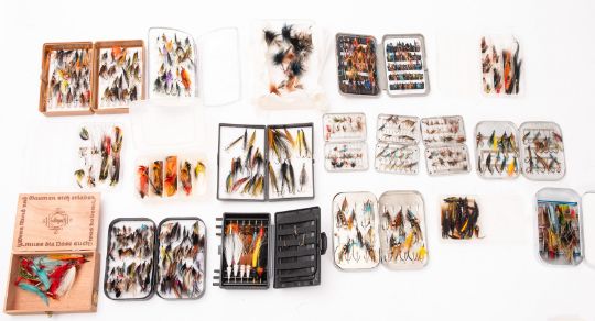 A mixed collection of trout flies. Various designs in metal tins and others.