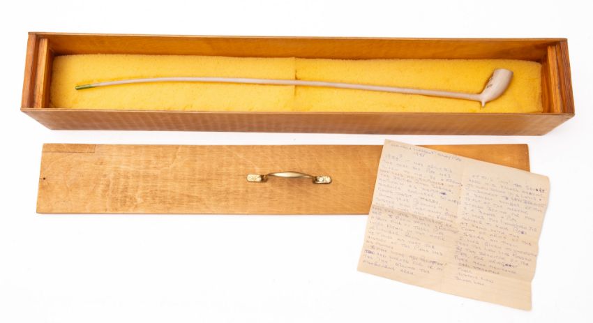 A 19th Century Church Warden's clay pipe, maker E Southorn, Brosley. Having the Vernon crest to the bowl and makers stamp to the side, 52cm long, within a wooden case.