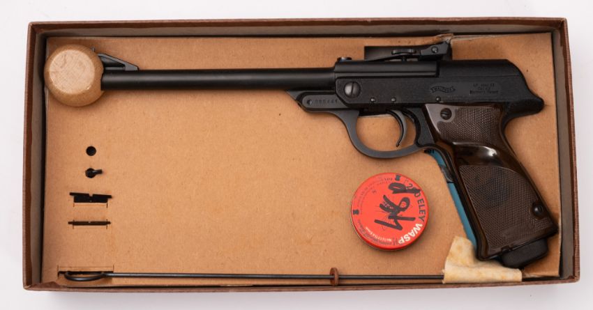A Walther Model 53 break barrel air pistol. Serial No. 095441, .177 calibre, having a 6' barrel on a metal stock with moulded grips and in original box.