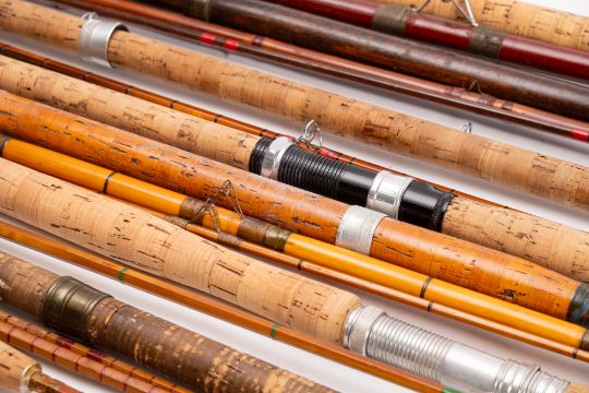 A group of ten various fishing rods, including a Bob Brooks of Hackney 'Maynard' 8' split cane rod, a Penzon & Michel 'Celibolic' split cane rod, a Lindop 'Lindsal' split cane rod and others (10)