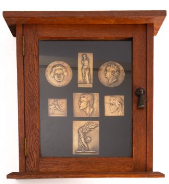 A cased group of seven early 20th century bronze medallions, including a rectangular medallion of the Venus De Milo, another after the Samo Thrace Nike, a bust of Beethoven after A Hartig and others, in a glazed single door wall display cabinet, the cabinet 44x41x8cm