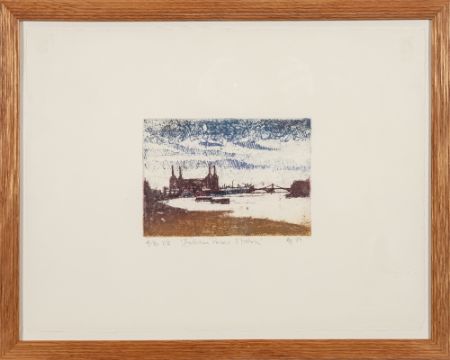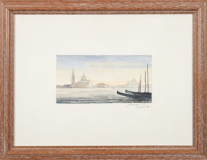After Isabel Hutchison (British, contemporary) - 'Battesea Power Station' - Limited edition etching 4/30 - 11 x 15.5cm, 34.5 x 42.5cm framed - Monogrammed, titled and numbered lower - 20th century school - A view of Venice - Watercolour on paper - 9.5 x 20cm, 33.5 x 43cm framed - Indistinctly signed and dated lower right. (2)