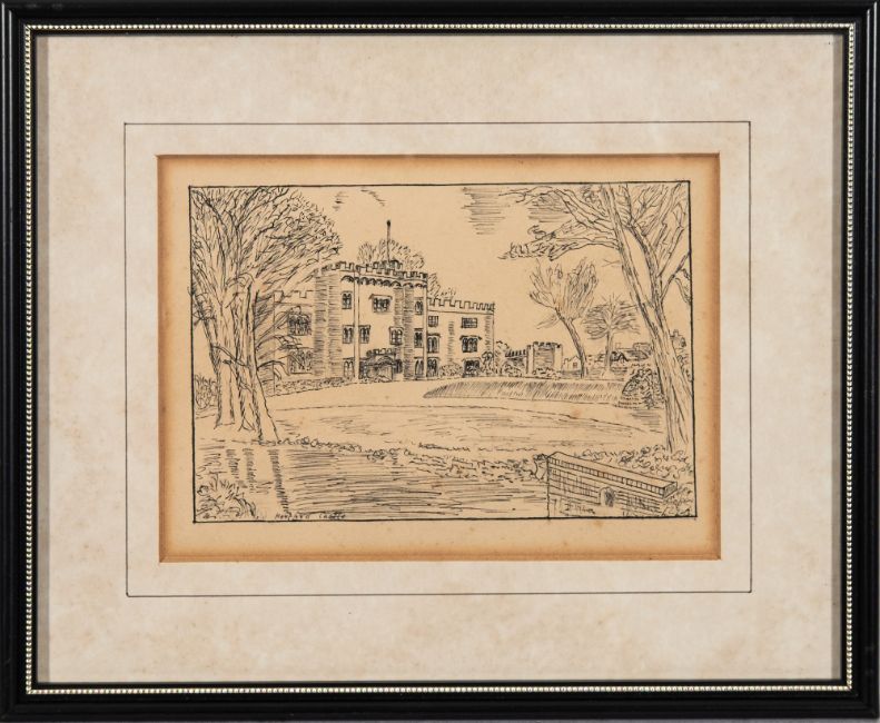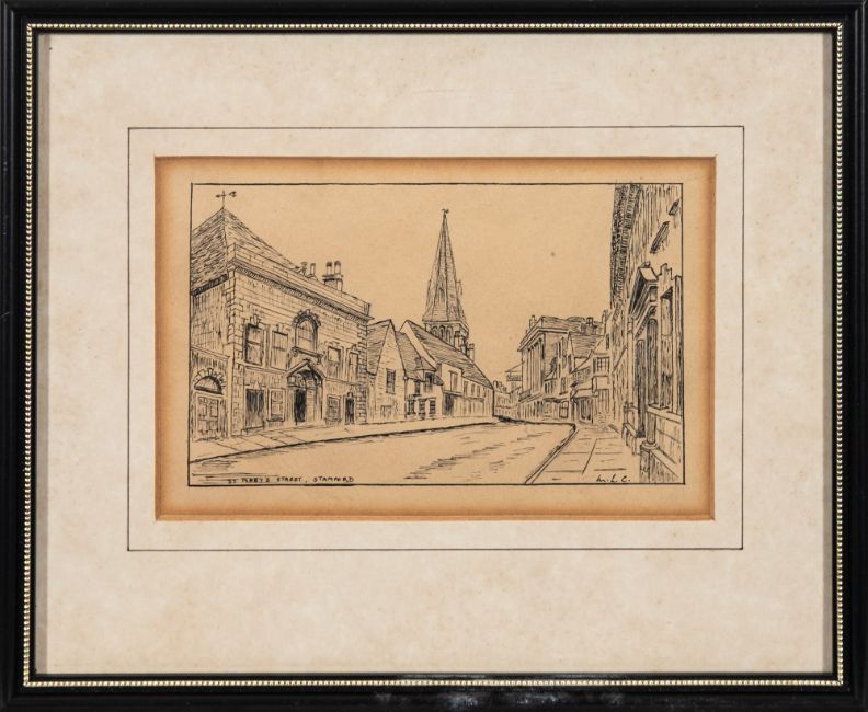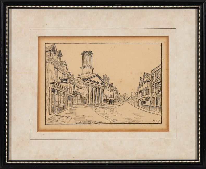 British School, 20th Century - 'Old Reading', 'Hertford Castle' and St. Mary's Street, Stamford' - Three pen & ink sketches - Each 12 x 16.5cm, 21 x 26cm framed - All monogrammed 'M.L.C' lower right. (3)