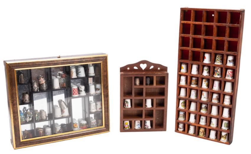 A large collection of porcelain and other thimbles, various makers including Royal Doulton, Royal Crown Derby, Portmeirion, Sea Creations and others, together with various display stands and case (a lot)