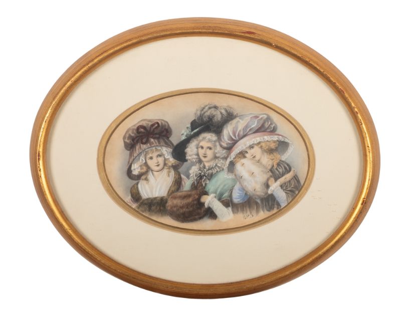 E.H.S possibly Eulalia Hillyard Swinstead (British, 1893-1978) - Three Georgian Socialites - Watercolour on paper - Initialled lower right, attributed verso - 10.5 x 15.5cm 21 x 27cm framed oval.
