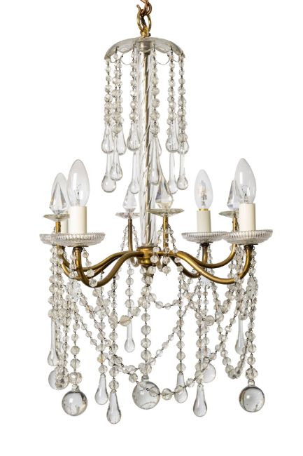 A gilt metal and cut and moulded glass hung six light chandelier, in Regency style, early 20th century; the electrical fitments in dished drip pans with Greek Key mouldings to undersides; on branches issuing from beneath a twist-moulded stem, rising to a lobed canopy; hung overall with faceted bead swags, moulded flower heads and pendants; with metal hanging ring and spherical glass terminal; 66cm high overall, 46cm widePROVENANCE: Purchased, Denton Antiques, London